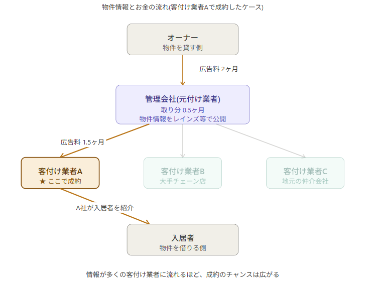 関西の賃貸仲介の構造図。オーナーから管理会社に広告料2ヶ月が支払われ、管理会社の取り分0.5ヶ月、客付け業者Aに1.5ヶ月が配分される流れ